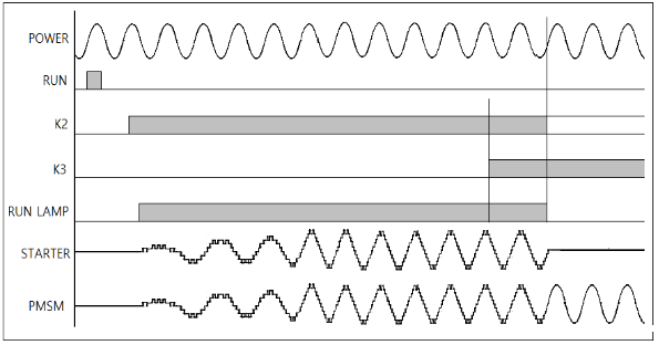 变频软起动器运行的过程为开始时先闭合接触器2(K2)而启动永磁同步电机(PMSM),最后根据电网的相序运行。电机速度达到电网频率之后,变频软起动器能够保证自身的功率输出和电网电压、频率、相位的同步并运行一定时间之后使电机进入稳态。然后闭合接触器3,即电网和变频软起动器同时给电机供电。最后,断开接触器2(K2),即只有电网给电机供电。此时变频软起动器停止。要变频软起停止,按停止按钮或停止键就可以。此时,接触器2和接触器3断开。