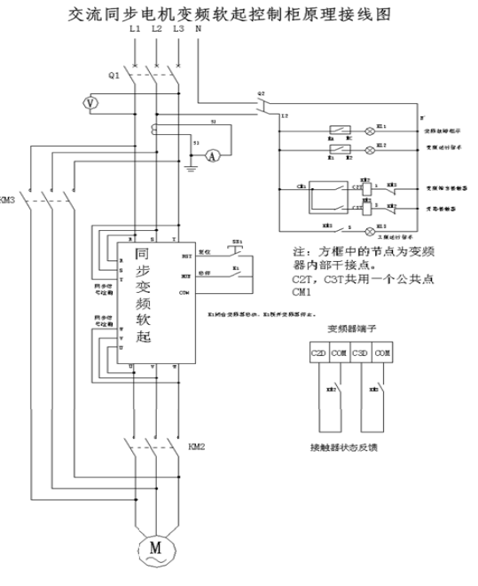 本装置利用变频技术实现永磁同步电机的平稳启动,电机达稳定状态后切入旁路接触器运行,此时装置待机保持监控状态,以大大提高装置的可靠性,并节省电能。